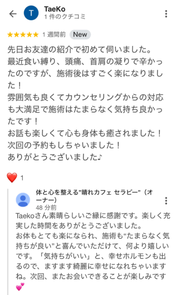 雰囲気も良くてカウンセリングからの対応も大満足で施術はたまらなく気持ち良かったです!