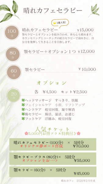 | 晴れカフェセラピー(100分) | 15,000円 | 顎セラピーとオプションを組み合わせ、体も心も緩めます。カウンセリングとコーチングの統合セラピーで前向きに、自分力を発揮して生きることを目指します。 |
